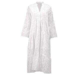 Women Eyelet Dress Boho Maxi Dress Elegant Lace Hollow Dress Summer V Neck Bell Sleeve Ruffle Casual Flowy Long Dress
