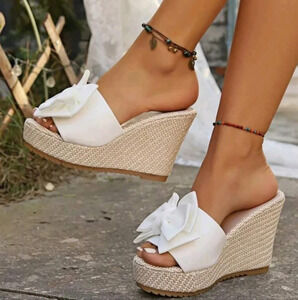 Women Fashionable Comfortable Wedge Heel Slide Sandals, Solid Color, Woven Beach