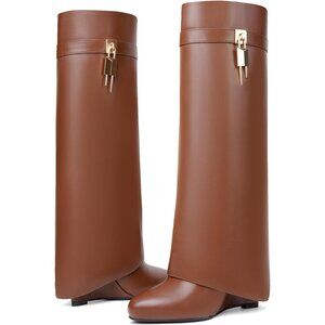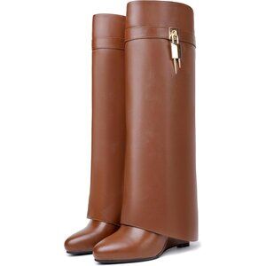 Women Faux Leather Brown Pull-on Wedge Heel Knee Shark Padlock Design Boot