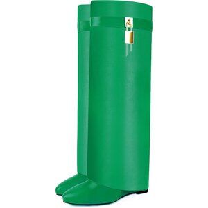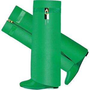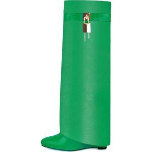 Women Faux Leather Green Pull-on Wedge Heel Knee Shark Padlock Design Boot