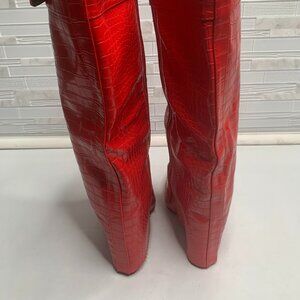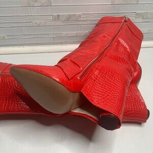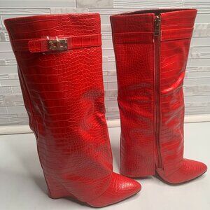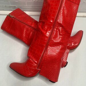 These Women's Faux Leather Knee High Boots by Boutique feature a stylish fold over detail and pointed toe design with gold hardware accents. The riding boot style makes it perfect for casual occasions, and the animal print pattern adds a touch of personality to any outfit. The knee-high design and zip closure provide comfort and convenience, while the red color and fabric lining make it easy to pair with a variety of ensembles. Step out in style with these trendy boots that are sure to elevate any wardrobe.