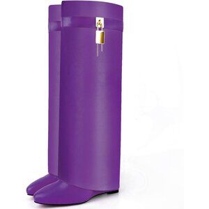Women Faux Leather Purple Pull-on Wedge Heel Knee Shark Padlock Design Boot
