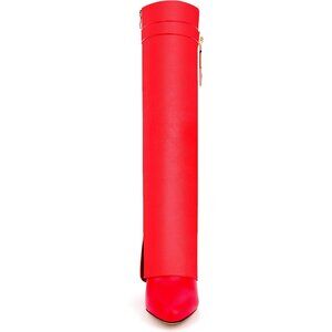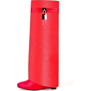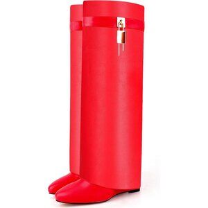 Women Faux Leather Red Pull-on Wedge Heel Knee Shark Padlock Design Boot