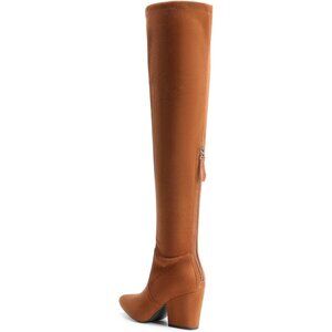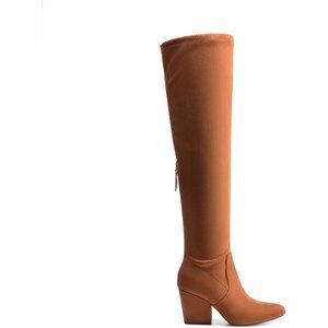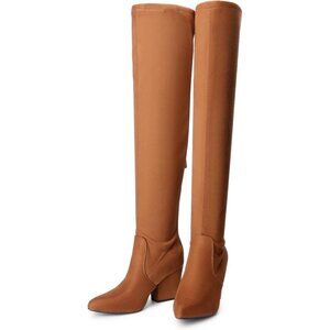 Women Faux Suede Brown Chunky Blocked Heel Thigh High Pointed Toe Fashion Boots