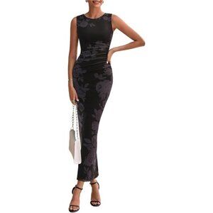 Features: Sleeveless, ruched detail, floral Print, mesh fabric, maxi length, slim fit, sexy style, bodycon lightweight dresses for women, providing a stunning look that's both comfortable and soft to the touch