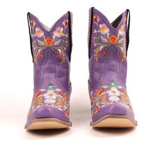 Women Flower Embroidered Ankle Booties Purple Synthetic Chunky Heel Short Boots