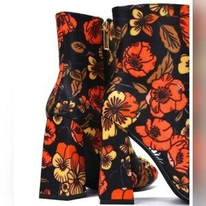 Women Flower Print Square Toe Chain Bit Buckle Block Heel Bootie