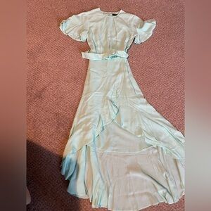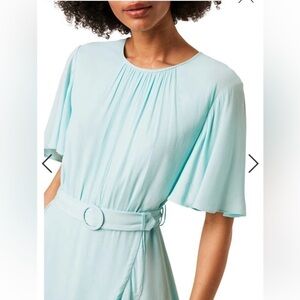 A classic midi dress is made fresh for the season ahead with fluttering sleeves, a belted waist and a cascading high/low hem.