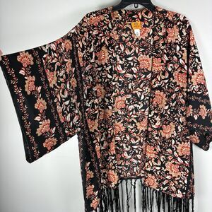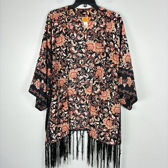 Women Kimono Open Front Cardigan 3X Plus Fringe Orange Black Boho Fall Artsy