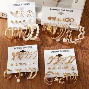 Women Gold 36 Pairs Pearl Chain Link Stud Drop Dangle Earrings Set