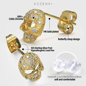 Women Gold Skull Earrings Sterling Silver Post Cubic Zirconia Stud Goth Jewelry,