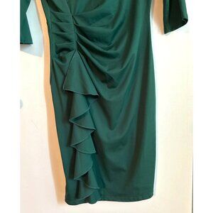 This midi dress offers a sleek and elegant style with its ruching front and cascading ruffle detail. Crafted from polyester-spandex blend, it ensures comfort while maintaining a professional appearance. Ideal for formal gatherings. The dress has a back zipper closure for easy wear and 3/4-length sleeves for a sophisticated look.