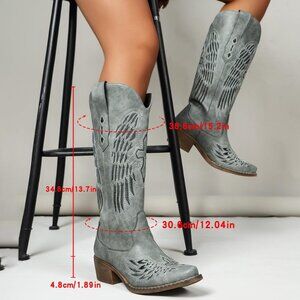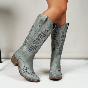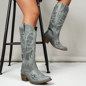 🆕Women Grey Embroidered Western Cowboy Boots Angel Wings Design, Slip On Mid
