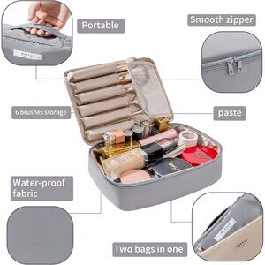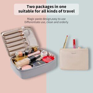 Travel Makeup Bag organizer has a large makeup bag and a small cosmetic bag. It contains 3 compartments, a main large compartment, a brushes Compartment and a detachable cosmetic bag.Have enough space to storage your Cosmetics, Skin Care Products, Cosmetic Accessories such as lipstick, eyeshadow palette, nail polish, eyeliner, powder, liquid foundation, eyebrow pencil