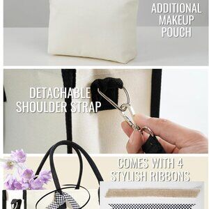 Features: Large 12 oz. poly-cotton canvas tote with a top zipper to keep your essentials secure. Easily fits your laptop, iPad, and daily must-haves. Inside zip pocket for keys, wallet, or earbuds, plus two side pockets for water or umbrella. Comes with a versatile makeup pouch and four stylish ribbons to customize your look.
