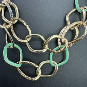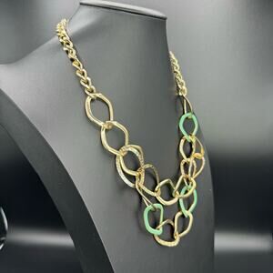 Women's Gold Tone Green Hammered Double Strand Curb Chain Statement Necklace