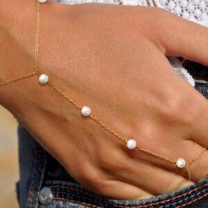 Women Hand Chain Bracelet Dainty Pearl Sterling Silver Gold Plated Adjustable — A unique and elegant accessory that highlights your hand and finger for a sophisticated look.