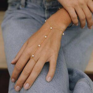 Features: This beautiful hand chain stretches from your wrist to your finger, with a delicate link chain adorned with small pearls and a sparkling zircon pendant. Hypoallergenic, waterproof, and made with high-quality brass, it’s comfortable to wear all day and adds instant charm to any outfit.