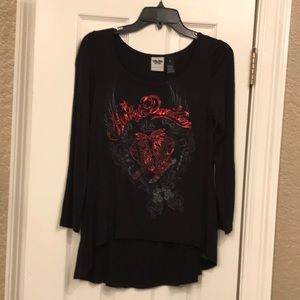 Gently used condition Harley Davidson Hi Lo top with 3/4 length sleeves. Front measures 17” and back is 27”. 18” across.