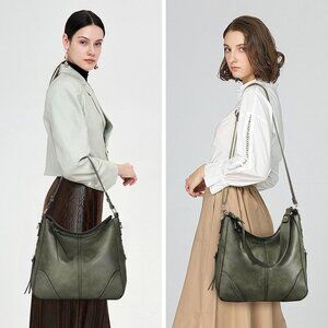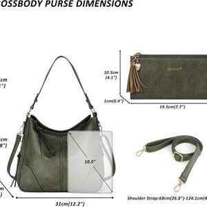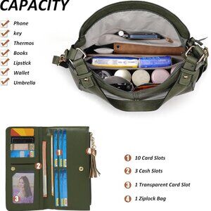 Features: Crafted with stylish PU leather, this set includes a spacious hobo bag with multiple zippered and open compartments—six zippered pockets plus three open spaces—plus a matching wallet with card slots, cash pockets, and a coin pouch. The bag has a back zipper pocket and two side pockets for quick access. The adjustable and detachable strap allows for versatility—wear it crossbody, shoulder, or handheld.