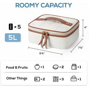Overall dimensions 9.75" x 7.75" x 4” / 25 x 20 x 10 cm, capacity 5L, spacious enough to fit 5 cans of cola (355ml). Perfect to carry ONE PERSON'S simple lunch or breakfast
