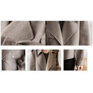 Women Khaki Wool Coats Notched Lapel Pea Coat Open Front Trench Overcoat Jacke