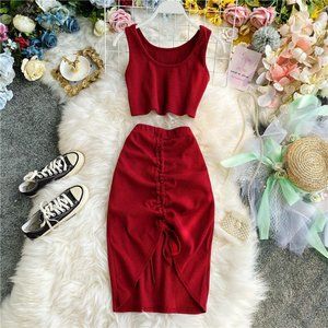 Women Knitted Short Tops + Drawstring Bodycon Skirt