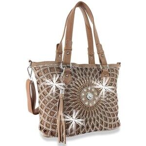 Women Large Tote Top Handle Shoulder Bags Bling Design Layered Shopper Tote Sparkling rhinestones create a sunburst motif full of polish and sophistication on the front of the ultra suede panel. It is finished in luxurious faux leather. * 1 back zip pocket. * 10L double handles; 22L detachable strap. * Faux leather with lined interior. * 2 interior slip pockets, 1 zip pocket & 1 center divider pocket. * Top zip closure. * Silver hardware. * Tablet compatible Color Taupe Approximate Size: 15L x 11H x 5W(std. size 8-10in).