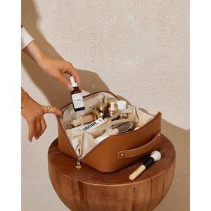 The Flat makeup bag that moves as fast as you do! It opens flat so you can see all your makeup at once — and then quickly scrunch things closed when you’re ready to go.