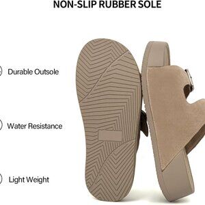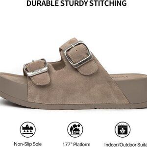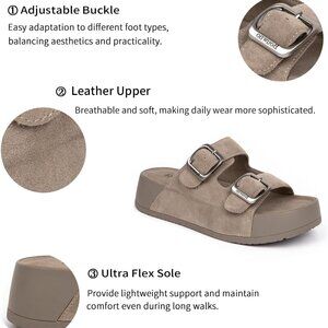 Features: These stylish slide sandals are made with soft leather uppers and feature a convenient slip-on design with a 1.77-inch platform for extra height and comfort. The double buckle closure ensures a secure fit, while the memory foam insole offers all-day support. Durable polyurethane soles with good grip make them great for walking on various surfaces.