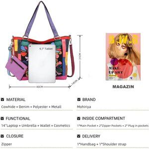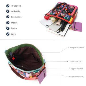 Features: Made of genuine leather with a striking patchwork design, this tote combines colorful floral patterns with a sleek black backdrop. It features a spacious interior, accessible zipper closure, and reinforced seams for durability. Perfect for carrying your laptop, wallet, cosmetics, and more—all in style!