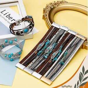 Features: This set includes 6 beautifully crafted wrap bracelets in five different styles, perfect for mixing and matching. Made from quality turquoise, alloy, and faux leather, these bracelets combine durability with style. The Western-inspired design features a stunning balance of natural turquoise, earthy browns, and shiny silvers, making each bracelet a statement piece. The sturdy buckle clasps ensure easy wear and secure fit. Designed with a bead chain for added charm, these accessories are as comfortable as they are eye-catching.