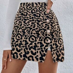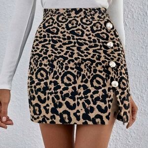 Women Leopard Print High Waist Split Button Detail Slimming Bodycon Skirt