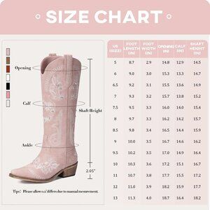 Comfort and Fit Wide calf cowboy boots provide all-day comfort, they not only fit well but are also roomy. Cowgirl boots offer great support while walking, including arch support and soft cushioning ensure every step feels like walking on clouds, with no break-in period required. Available in size options ranging from 5 to 13, ensuring accurate sizing and a great fit, with zipper features and width options for calf and leg fit.
