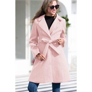 Women Light Pink Peacoat Dress Belted Notch Lapel Overcoat Winter Trench Coat