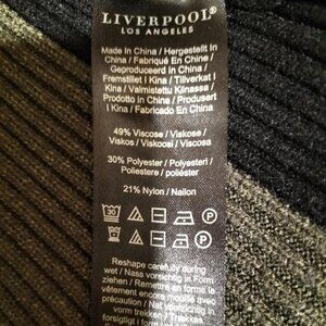 This is a dark green V-neck sweater from Liverpool Los Angeles in size L for women. It features a twist front design and is made from a knit fabric blend of polyester, viscose, and acrylic. The sweater has a pullover style and falls under the designer theme category. It's in very good condition.