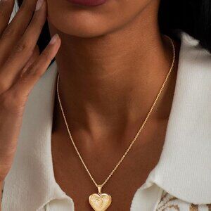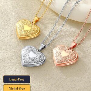 Features: Elegant heart-shaped locket with delicate flower engraving, designed to hold a photo, message, or DIY keepsake. The 1.5-inch locket adds a touch of romance, while the sturdy Rolo chain and lobster clasp make it easy to wear. Crafted with eco-friendly copper and 18k gold plating for a luxurious feel.