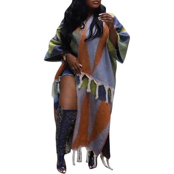 Women Long Open Front Sweater Cardigan Fringe Color Block Maxi Plus Size — Perfect for a cozy, boho-chic vibe.