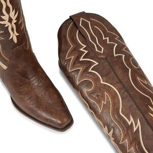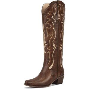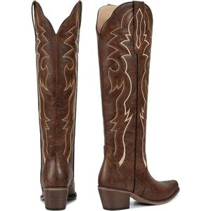 ⚡Women Matte Brown Faux Leather Cowgirl Knee High Chunky Heel Pointed Toe Boots
