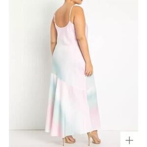 This Eloquii Women's Maxi Pastel Sun Dress in size 18 is a stylish and elegant choice for a beach wedding or casual summer occasion. The dress features a flattering cowl neck, sleeveless design, and a slimming slit that adds a touch of coquette flair. With a beautiful tie-dye pattern in pink and blue hues, this dress is made from polyester chiffon fabric that is machine washable for easy care. Perfect for the summer and spring seasons, this dress is a lovely addition to any woman's wardrobe, designed for a plus-size fit.