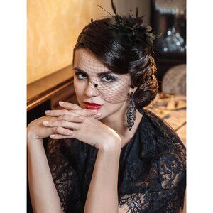 Women Mesh Fascinator Hats Set Veil Feather Headbands — Elegant vintage charm for special occasions.