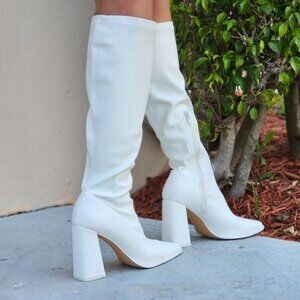 Women Mid Calf Square Toe Heel Boot Whte Color