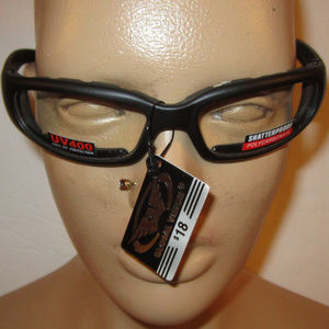 Comfortable vented EVA foam padding on the entire inside of the glasses to fit snug to your face and protect against wind and dust. Measurements are about 5" from inside arm to inside other arm and lenses are 2-1/4" wide by 1-1/8" tall. Arm length is about 4-3/4"