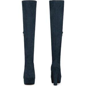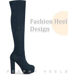 Women Navy Blue Suede Chunky Heel Rounded Toe Over the Knee Thigh High Boots