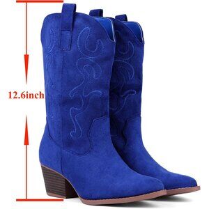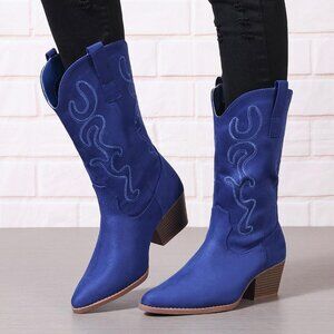 Women Navy-blue Suede Mid Calf Chunky Block Heel Western Embroidered Boot