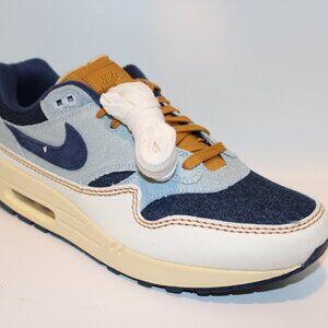 The Women's Nike Air Max 1 ’87 in a Denim Aura colorway has an upper with a base of midnight navy denim. Lighter denim with a faded, over-washed look overlays the side panel, eyestays, and heel. Overlays of white denim with brown stitching adorn the mudguard. Brown laces that match the mudguard stitching crisscross over a brown denim tongue with exposed foam. The sock liner is midnight navy, while the insole is brown with sail-colored Nike Air branding. We also see Nike Air branding embroidered on the brown leather tongue patch and on the denim heel counter.