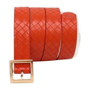 Women Orange Color Basket Weave Skinny Belt Gold Metal Square Buckle Size S M