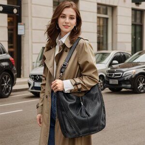 Features: This large, versatile bag is made of soft high-quality vegan leather, with an oversized shape that comfortably fits your essentials. It has a sturdy, adjustable shoulder strap and a removable top handle, so you can wear it as a crossbody, shoulder bag, or handbag. Decorated with tassels and well-structured, it’s comfortable to carry and casually elegant.