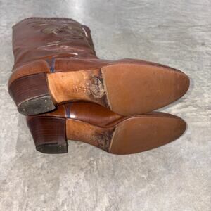 These vintage Pollini Women’s Brown All-Leather Riding Boots, size 38, are a stunning blend of classic style and intricate craftsmanship. Made in Italy, these boots feature high-quality leather that’s both durable and soft, offering a luxurious feel. The design is highlighted by unique embellished shell and floral accents, adding a touch of elegance and artistry to the timeless riding boot silhouette. With a sleek, tall profile, these boots offer both comfort and sophistication, making them a standout addition to any wardrobe. Perfect for both casual and dressier occasions, the Pollini boots combine vintage charm with a modern edge, reflecting the brand’s dedication to style and quality.
