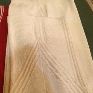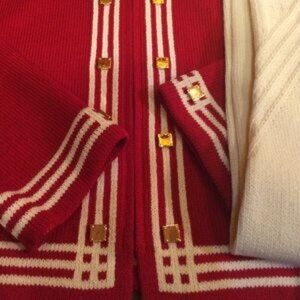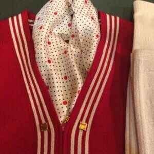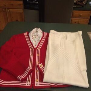 3- piece ST John outfit (too, pants and scarf). The pants are lt. cream color SZ 8 and the top is red with cream trimming. Gold color buttons and zipper on the top. The top is a SZ 6 but runs big (more like an 8). Just in time for Valentine's Day.